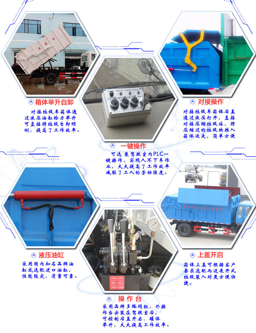 該車箱體有效容積:15-17立方,優(yōu)質(zhì)碳鋼板材制作,底部支撐加強(qiáng)板,骨架車廂按照耐受壓力**大的外框式優(yōu)化設(shè)計(jì)制作??v、橫梁骨架及頂部骨板全部采用優(yōu)質(zhì)鋼材壓拉成型。配備液壓裝置后蓋可液壓開啟,車廂可液壓自卸,駕駛室內(nèi)集成操作,車型密封設(shè)計(jì),杜絕運(yùn)輸過(guò)程中的二次污染。