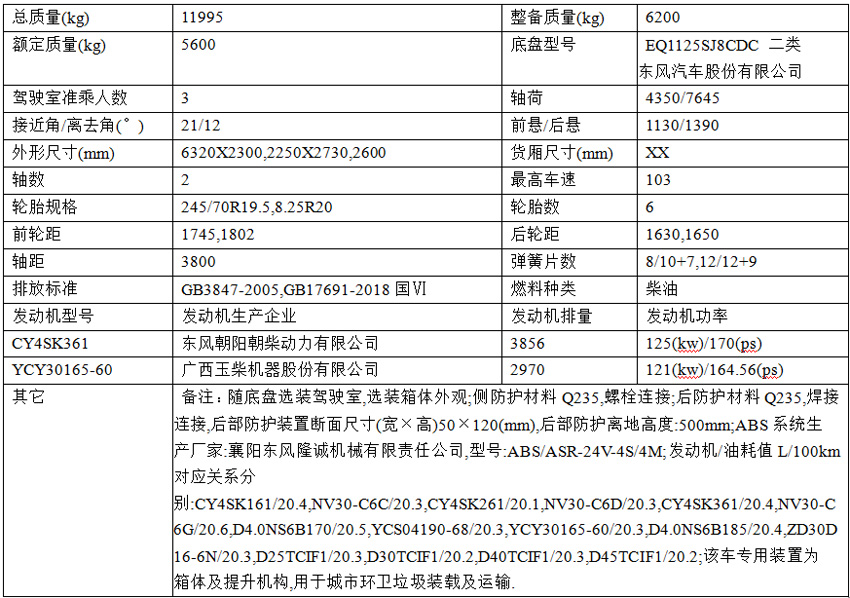 3800mm軸距,東風(fēng)多利卡D7或東風(fēng)凱普特K7 2030mm單排駕駛室,可選用朝柴170馬力或玉柴165馬力國(guó)六排放柴油發(fā)動(dòng)機(jī),5.5噸后橋,萬(wàn)里揚(yáng)6檔變速箱,原廠空調(diào),電動(dòng)窗,中控鎖,斷氣剎,ABS。發(fā)動(dòng)機(jī)型號(hào)不同底盤(pán)配置略有不同,詳細(xì)配置請(qǐng)以購(gòu)車合同為準(zhǔn)。
