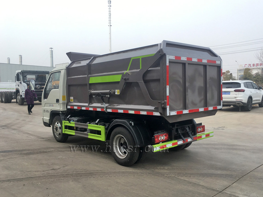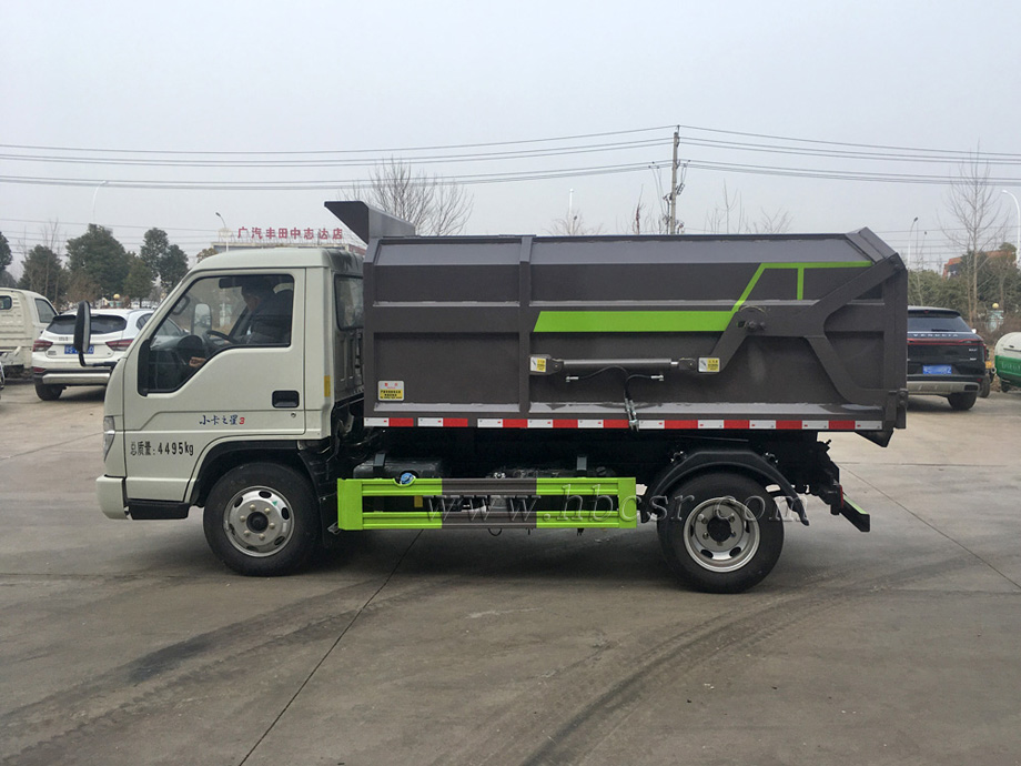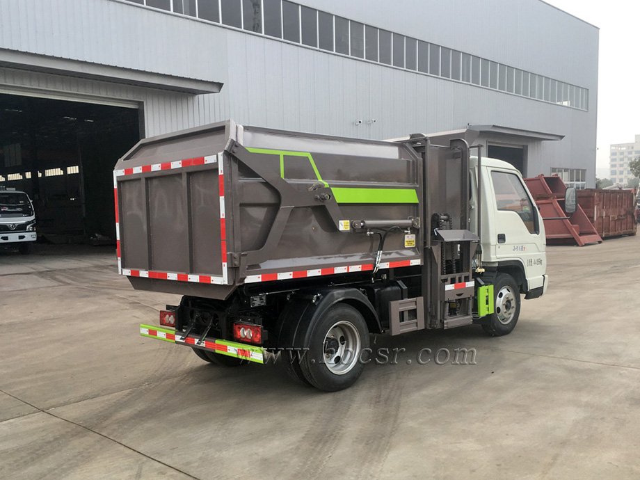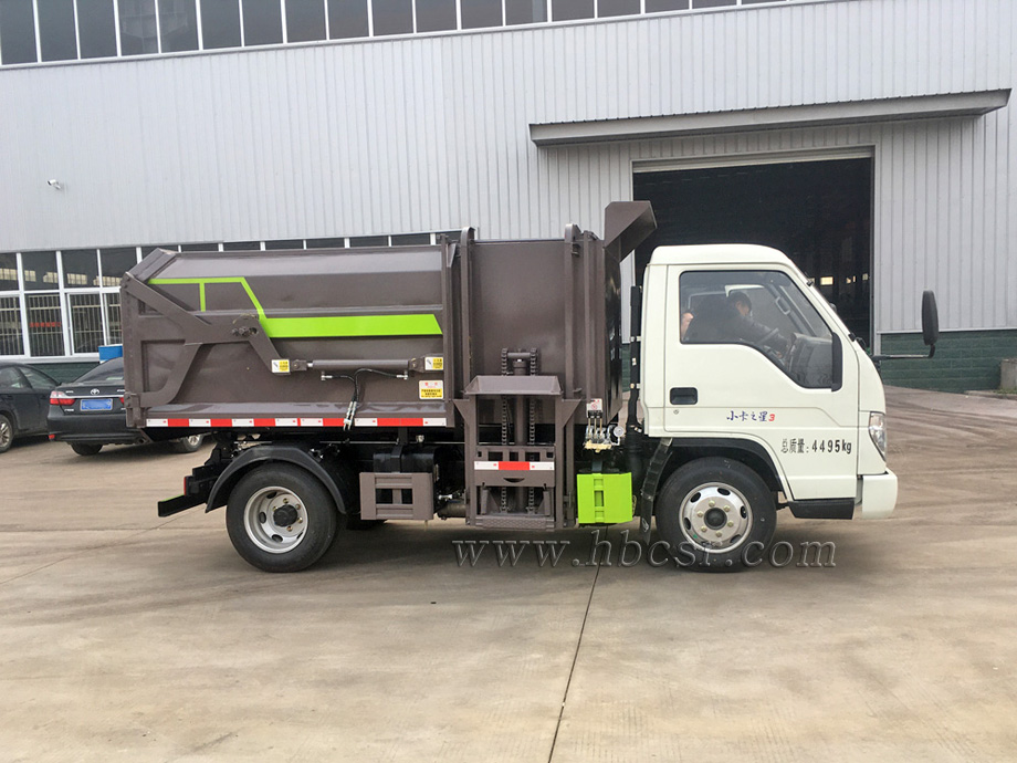 該車箱體容積約4立方,箱體前部側(cè)面帶有掛桶提升機(jī)構(gòu),可自動舉升垃圾桶倒入垃圾,帶自卸功能,尾部裝有橡膠密封條,防污水滴漏,杜絕二次污染。掛桶垃圾車可根據(jù)客戶要求搭配120升或240升塑料桶和鐵桶。