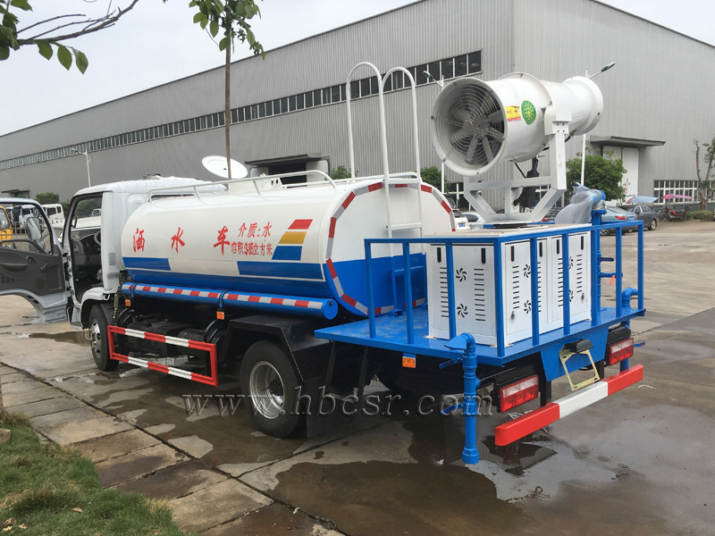 整車具有前沖、后灑、側(cè)噴(標(biāo)配鴨嘴噴頭可更換為側(cè)位花灑)、后置式工作平臺(tái)(帶踏梯,四周有安全護(hù)欄)、平臺(tái)上設(shè)置有高壓水炮(可360°旋轉(zhuǎn),可調(diào)成柱狀,射程28米,也可調(diào)成霧狀,射程14米,可連續(xù)調(diào)成:直沖狀、開花狀、雨?duì)?、半霧狀水流)。整車灑水寬度大于14米,配備優(yōu)質(zhì)大功率灑水泵,雜物過濾網(wǎng),國標(biāo)通用65型消防接口(可通過消防栓加水)、1套自流球閥系統(tǒng)(可自吸自排,**大吸程6米),2根抽水鋼絲膠管 (帶陰陽快速接頭),配鎖,水位計(jì),作業(yè)高音喇叭。兩側(cè)及后加強(qiáng)型保險(xiǎn)杠,防滑爬梯,膠管儲(chǔ)存筒。