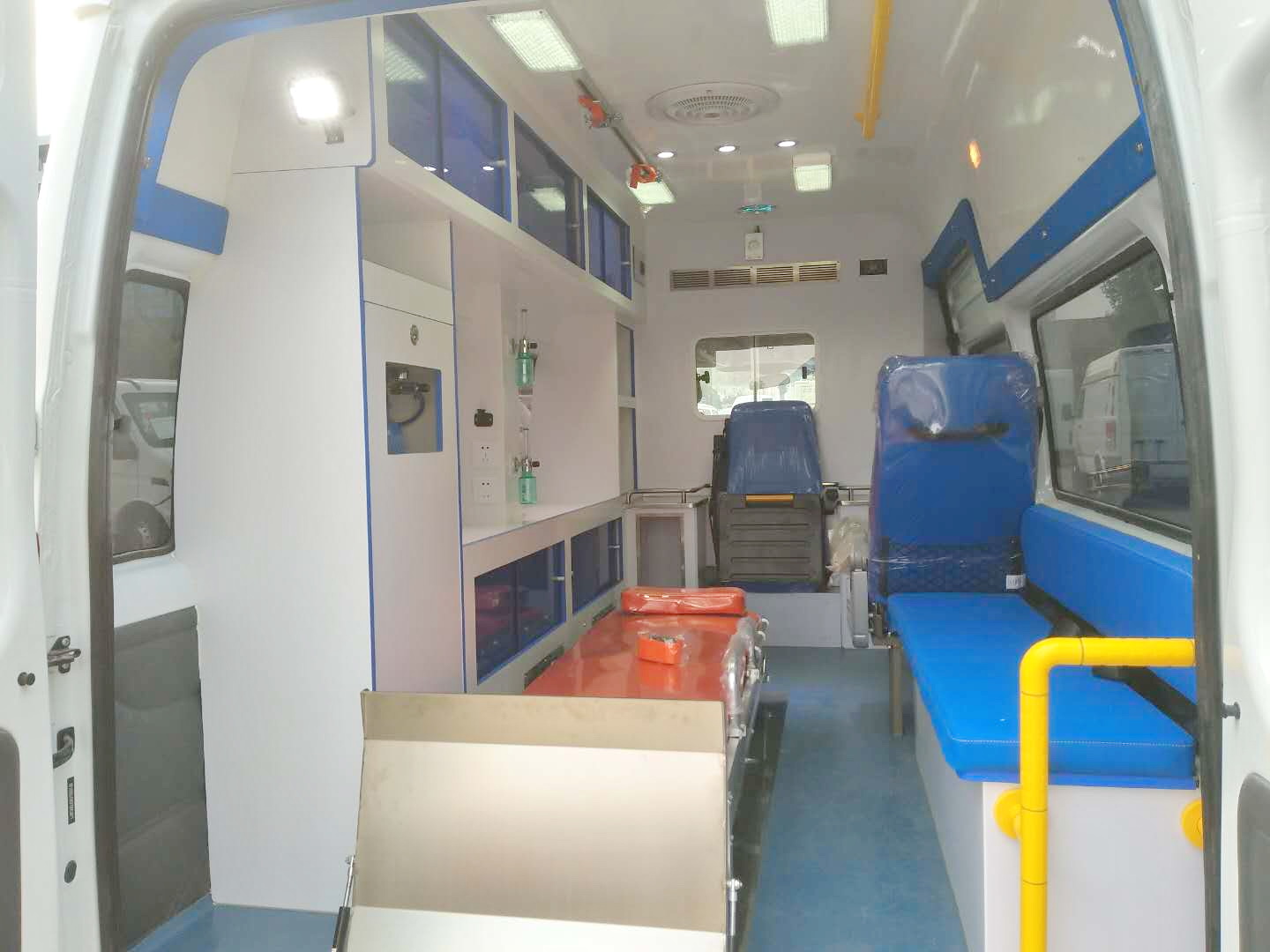 一體化內(nèi)飾;鏟式擔(dān)架;折疊擔(dān)架;自動(dòng)上車擔(dān)架;中隔板(帶觀察窗);上車后踏板;輸液瓶夾持器;