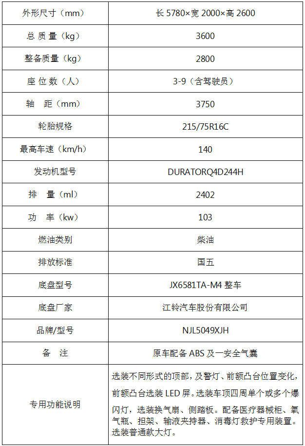 江鈴福特長(zhǎng)軸監(jiān)護(hù)型救護(hù)車 車輛基本配置: