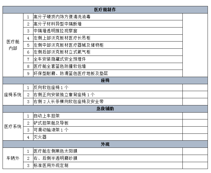 該車配備醫(yī)療器械柜,氧氣瓶,擔架,消毒燈救護專用設備;選裝一體踏板車長(mm):5785,選裝后踏板車長(mm):5910,選裝車頂,側爆閃燈,后爆閃燈,換氣扇,側踏步,后踏步,選裝中頂異型頂車高為(mm):2480,高頂選裝異型頂車高(mm):2650,選裝高頂車高(mm):2737;ABS生產(chǎn)企業(yè):博世汽車部件(蘇州)有限公司,博世汽車部件(蘇州)有限公司,ABS型號:ABS 9.0,ESP9。