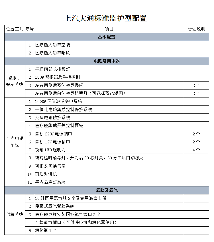 • 上汽大通標準監(jiān)護型救護車基本車型參數(shù):