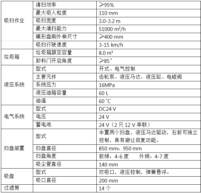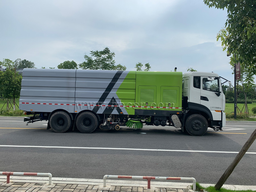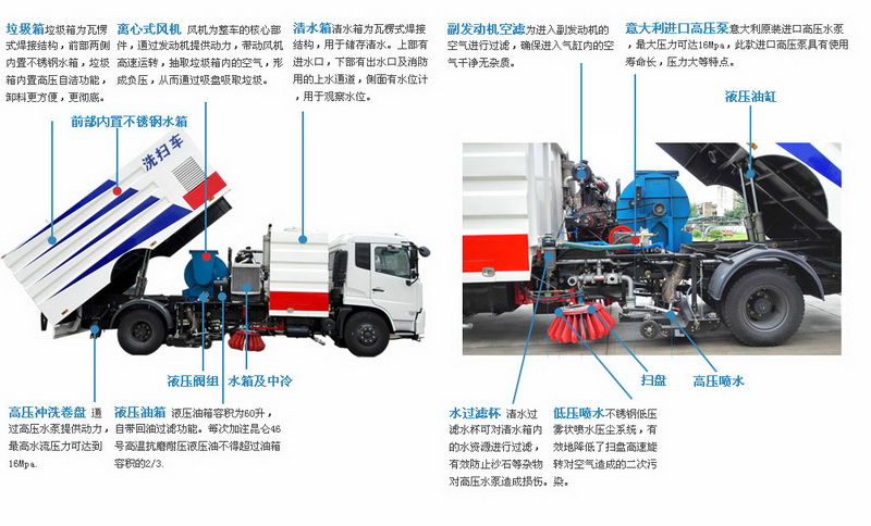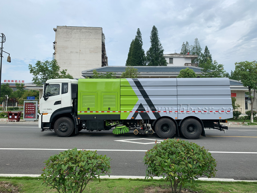 8)采用先掃,后沖刷,再吸收的工作方式,能將垃圾及污水一次清掃、沖刷、吸收干凈。路面作業(yè)后無塵土,無積水;