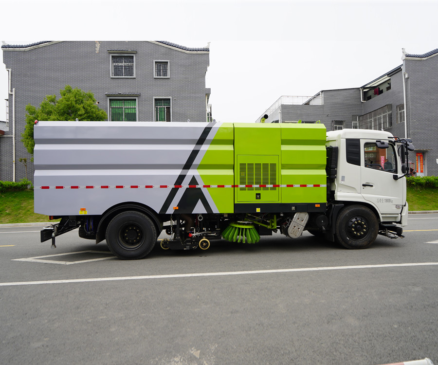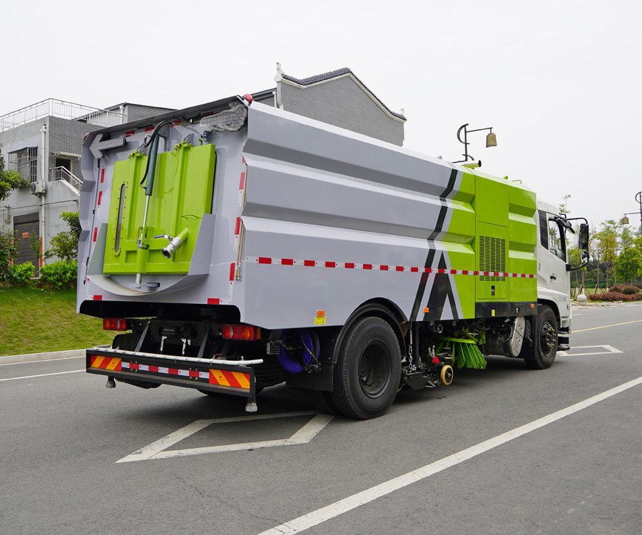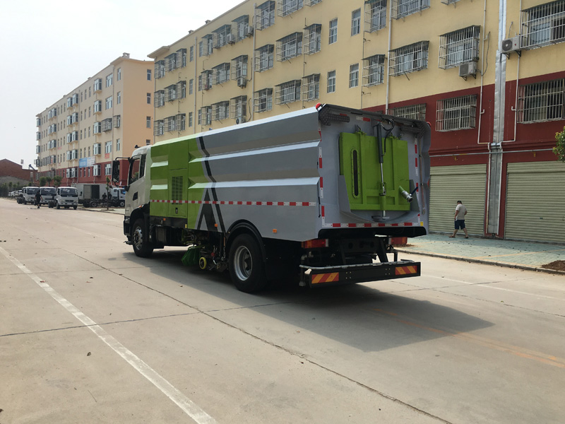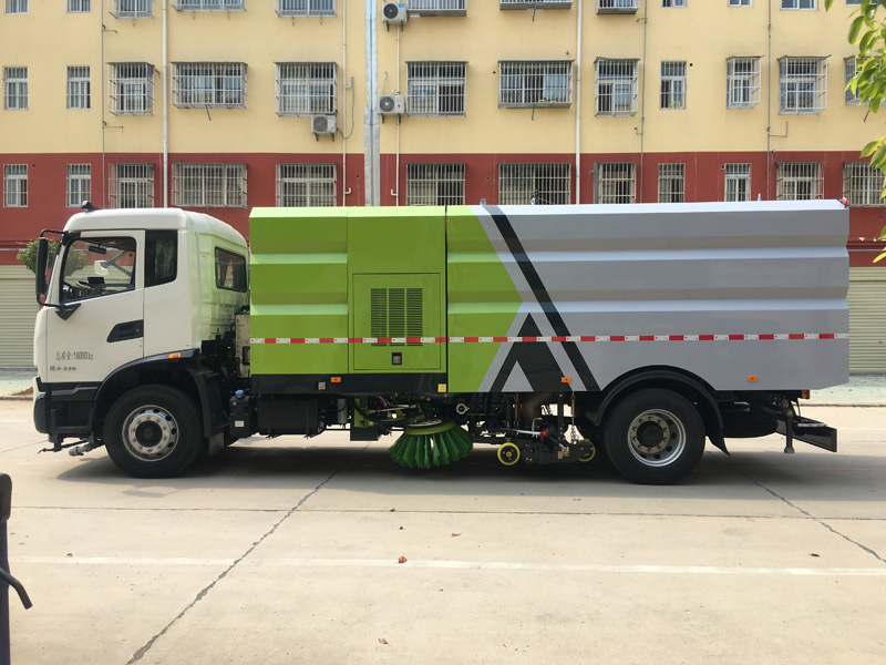 清掃:副發(fā)動機驅(qū)動液壓油泵和風機工作。液壓油泵驅(qū)動左、右掃盤伸縮、升降、旋轉(zhuǎn)。左右掃盤將兩側(cè)的垃圾掃至洗掃車下面、吸嘴前方。風機工作使垃圾箱、吸管和吸嘴組成的風道產(chǎn)生高速氣流,在氣流的作用下,垃圾吸入吸嘴,并進入垃圾箱中。底盤發(fā)動機驅(qū)動洗掃車向前行走,掃**吸嘴前方的垃圾不斷進入到吸嘴中,并源源不斷地被吸到垃圾箱中,實現(xiàn)路面清掃。