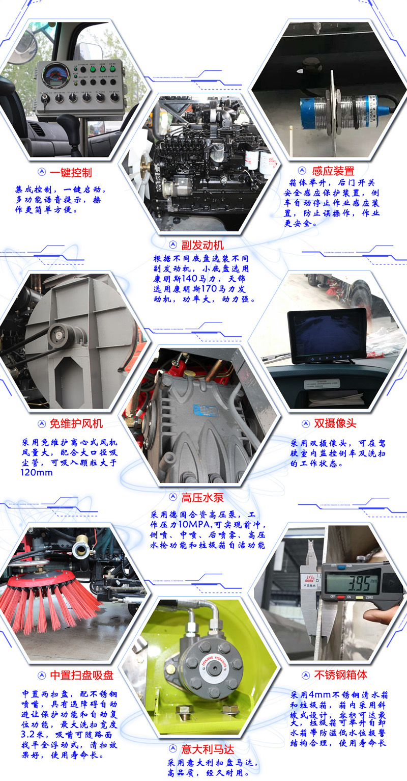 | 選裝配置: | 用戶可根據(jù)個人需求選擇加裝霧炮機組、電子遙控水炮、雪鏟、高壓清洗架、**吸管裝置等配置。 |